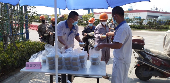 7月以來,持續(xù)的高溫天氣,考驗(yàn)了船廠的修造工人,公司除了調(diào)整作息時(shí)間,避開高溫時(shí)段;生產(chǎn)現(xiàn)場增加高溫生產(chǎn)安全防護(hù)外,經(jīng)相關(guān)部門商議,決定不定期向工人們送防暑降溫冷飲,送發(fā)地點(diǎn)安排在員工寢室樓兩個(gè)通道出口處。