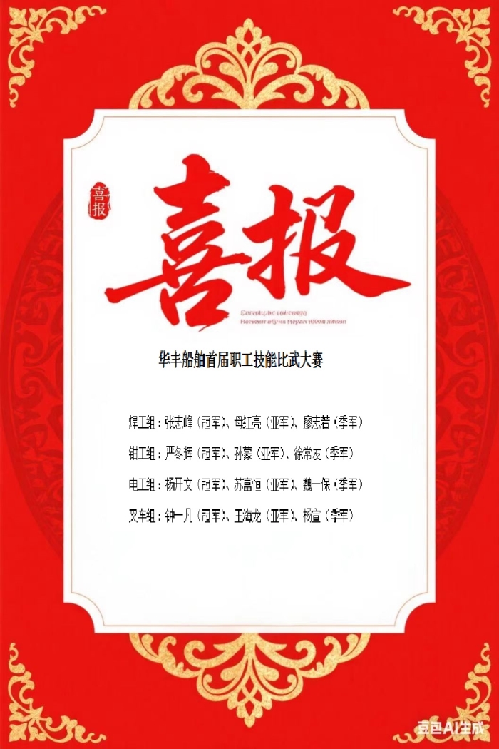“這是技能的擂臺,更是成長的舞臺?!贝筚惖某晒εe辦,標(biāo)志著華豐船舶在弘揚(yáng)工匠精神、構(gòu)建人才梯隊方面邁出堅實步伐。未來,公司將持續(xù)深化"干一行、愛一行、精一行"的企業(yè)文化,讓員工成長與企業(yè)發(fā)展戰(zhàn)略同頻共振,共同書寫高質(zhì)量發(fā)展新篇章!