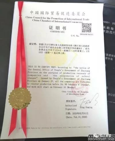 Picture: On the morning of February 2nd, the China Council for the Promotion of International Trade issued the country's first force majeure factual certificate of a new type of coronavirus pneumonia to an auto parts manufacturing company in Huzhou, Zhejiang.